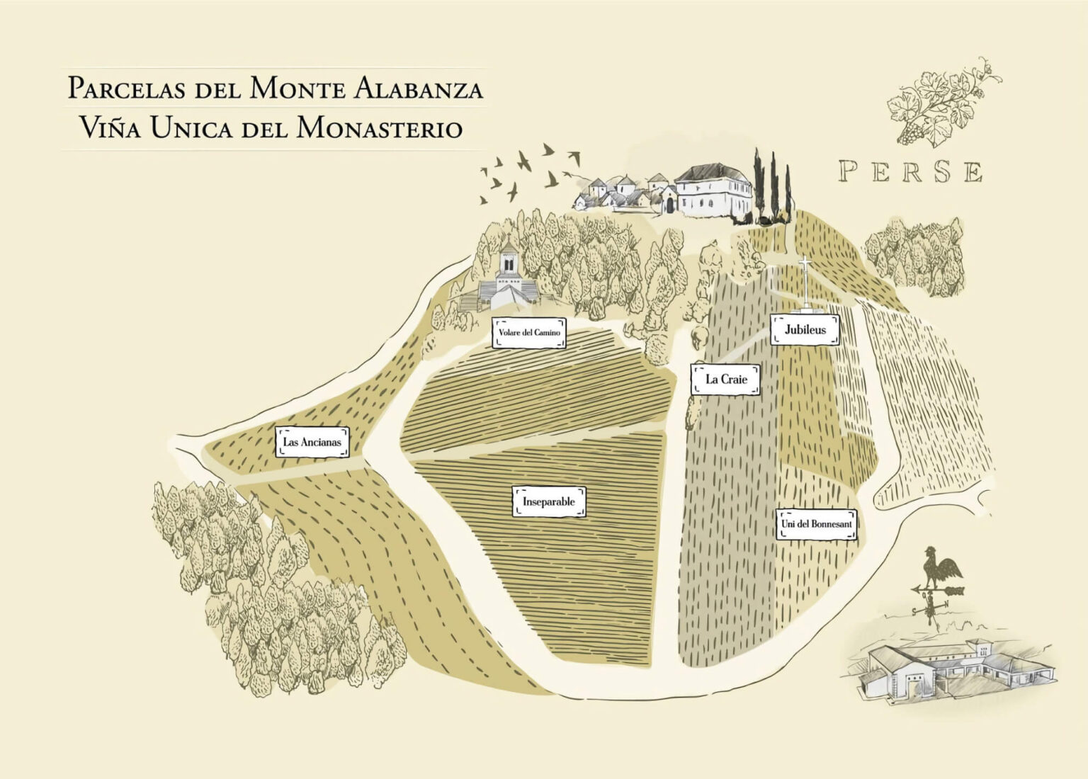 They are planted at different densities (from 4,630 and up to 7,000 plants per hectare), in very dissimilar architectures that attempt to adequately harmonize each combination of soil-climate-plant.The very particular climatic condition in the the different Monastery geographies led us to look for the best soil- vine spacing-training system combination. At high altitudes and low temperatures, vines needs more restrictive soils, with a great proportion of calcareous rocks or stones and more complex horizon layers. Free plants or slightly trained in order to reduce their vegetative expression, that is small canopies and low yields per vine.